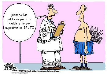 Aquí podemos observar cuando el doctor le explica al paciente que las píldoras para la calvicie no eran supositorios. JAJAJA